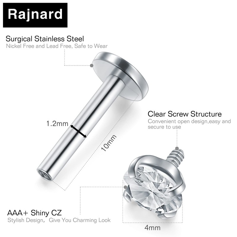 Rajnard 16G Surgical Steel Lip Piercing Stud Silver Cartilage Tragus Helix Earrings Piercing Labret with Zircon 6/8/10/12/14/16/19 mm Internal Thread Piercing Jewellery for Women Men, Stainless Steel