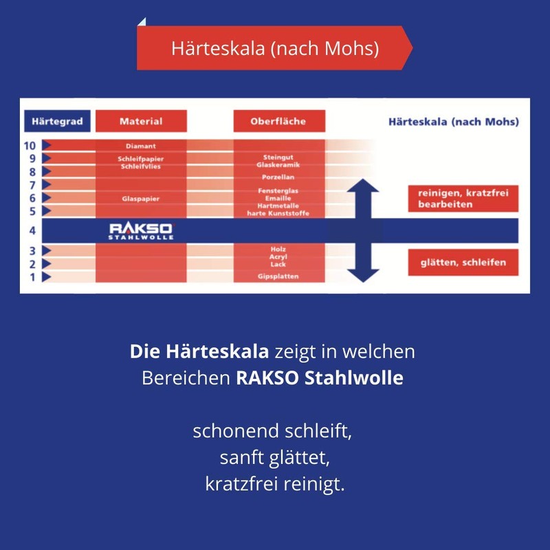 - Rust-proof stainless steel wool is the basis for RAKSO stainless steel wool. Therefore ideal for working in wet areas or in conjunction with chemical aids. Prevents "blue discolouration" in the grain of tannic woods.