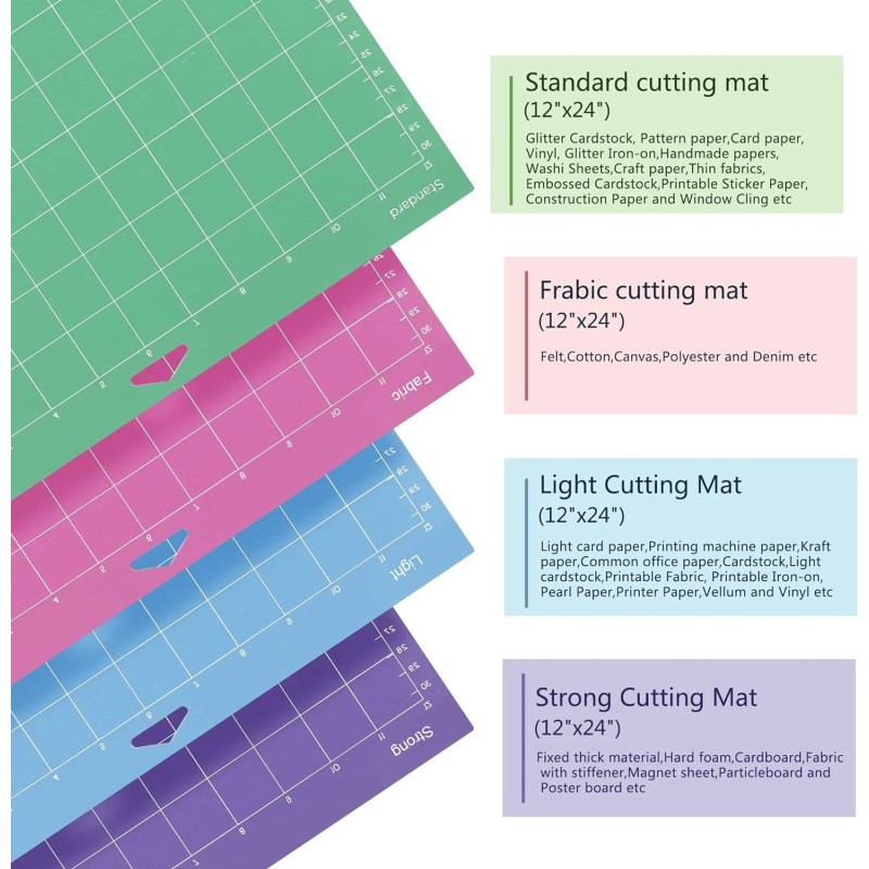 【Suitable for Various Materials】Different adhesive matches different materials:The standard grip which is perfect for cardstock,printable paper, iron-on, vinyl, washi and window cling material. The Purple cutting mat has a strong grip perfect for thick cardstock, Faux Leather, poster board,Chipboard and fabric stabilized with a backing. The light grip blue mats is great for light cardstock, common office paper, vinyl, vellum and other lightweight materials that require a lighter hold.