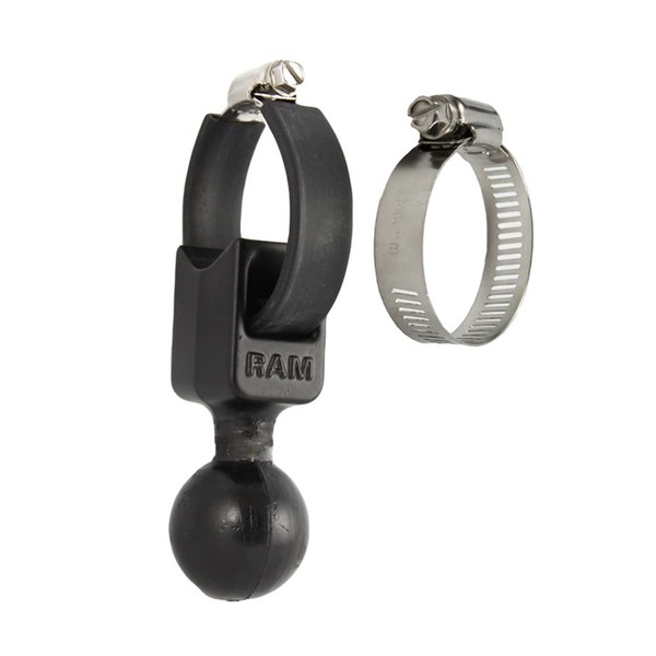 - Hose clamp base for rails between 25.4mm (1") to 53.34mm (2.1") in diameter. The diameter is the value when installing the hose clamp base. It has a 1.5" rubber ball and is designed to be right angle against the mounting rails