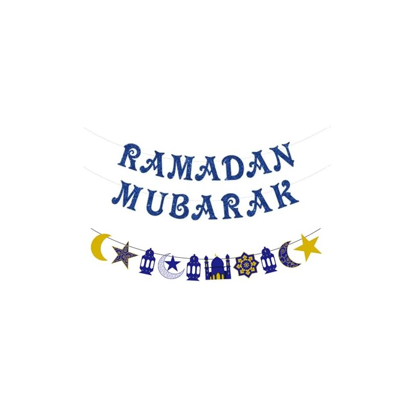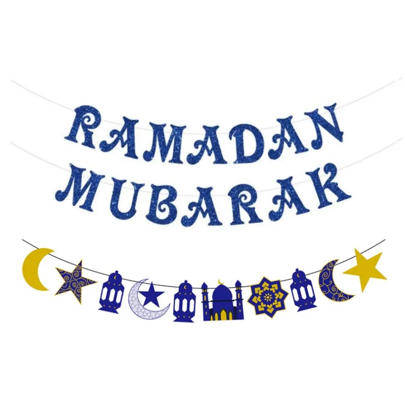 Ramadan Mubarak Blue Glitter Banner, Ramadan Decorations at Home, Islamic Party Decorations