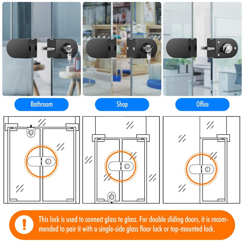 Ranbo Frameless Double-Sided Glass Door Lock, No-Drill, 304 Stainless Steel, Suitable for 3/8''-1/2''(10mm-12mm) Sliding Glass Doors,Office Doors,Commercial Doors, Includes 3 Keys,Black