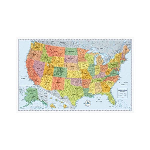 With a combination of bold colors and precise detail, signature laminated wall maps are an invaluable reference tool for home, office or classroom. Color-matching relief allows you to trace mountain ranges easily while still locating City and state names quickly. Clearly labeled state capitals, national parks, time zones and major highways.