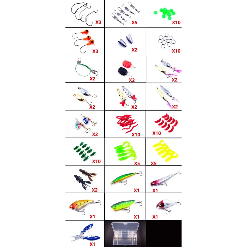 - 101 PCS Fishing Lures Kit: Include 8x hard plastic baits, 46x soft silicone baits, 10x sequin lures, 1x fishing pliers, 10x guide rings, fishing hooks and other accessories, 101 pieces in total with tackle box.