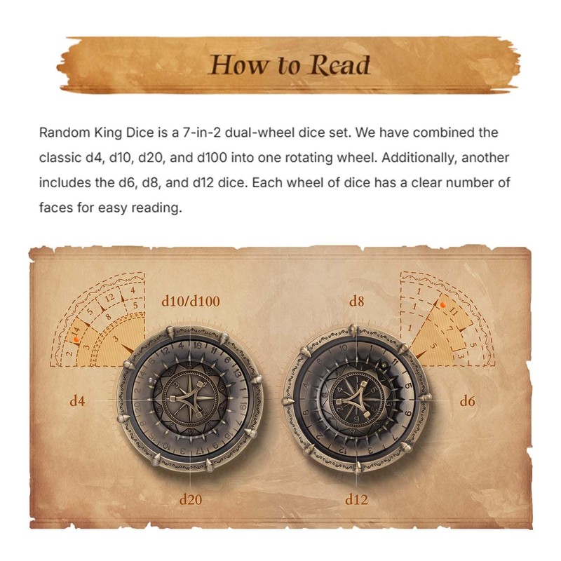 • Whats in the Box? – Random King Dice is a 7-in-2 dual-wheel dice set. We have combined the classic d4, d10, d20, and d100 into one rotating wheel. Additionally, another includes the d6, d8, and d12 dice. Each wheel of dice has a clear number of faces for easy reading. Steel Balls:Silver-3.5mm*4pcs+Silver-2.5mm*10pcs+Gold-2.5mm*10pcs+User Manual*1