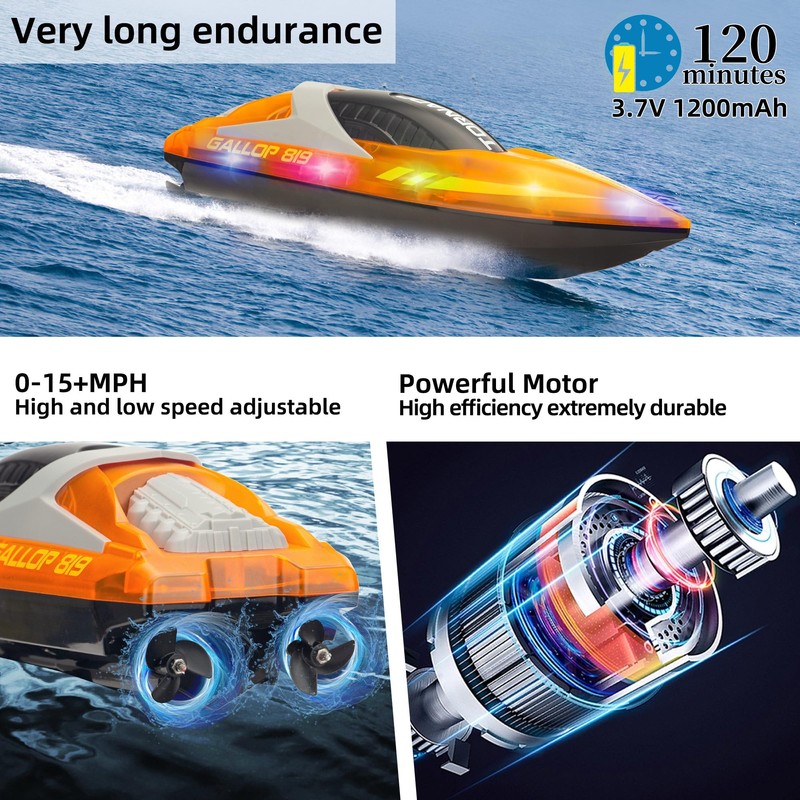 • 【Rich Functions】In addition to having bright LED lights and long endurance, the remote control boat also has low battery warning, over distance warning, One-key capsizing reset and off-water protection function.These rich functions can make you have more fun.