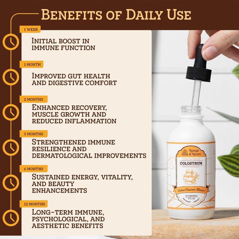 Range & Roots Colostrum Supplement - Liquid Bovine Colostrum - Alternative to Colostrum Powder - Support Gut Health, Immunity, Energy - Healthy Hair, Skin & Nails - Salted Caramel Flavor (30 Servings)