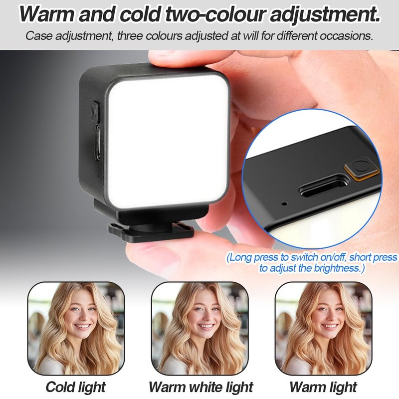 • Compact mini LED video light with adjustable brightness. Mini selfie light 3-speed colour temperature setting, with 16 energy-saving LED beads (8 yellow + 8 white), 3000K, 4000K, 6000K cool and warm colours, three fixed switching modes.