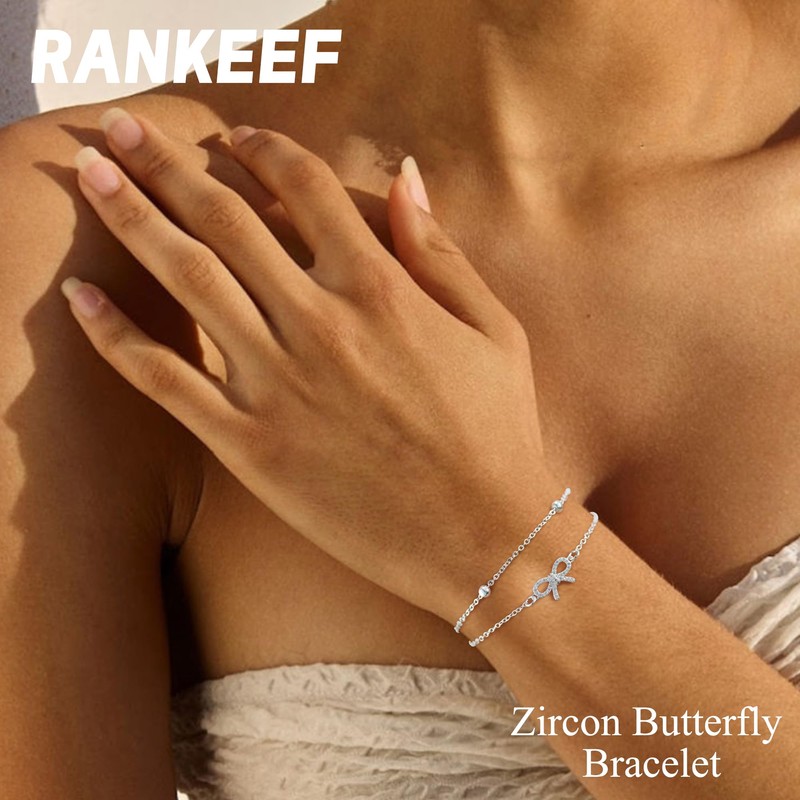 RANKEEF Layered Silver Bracelet For Women Bow Beads Adjustable S925 Sterling Silver Bracelet For Women