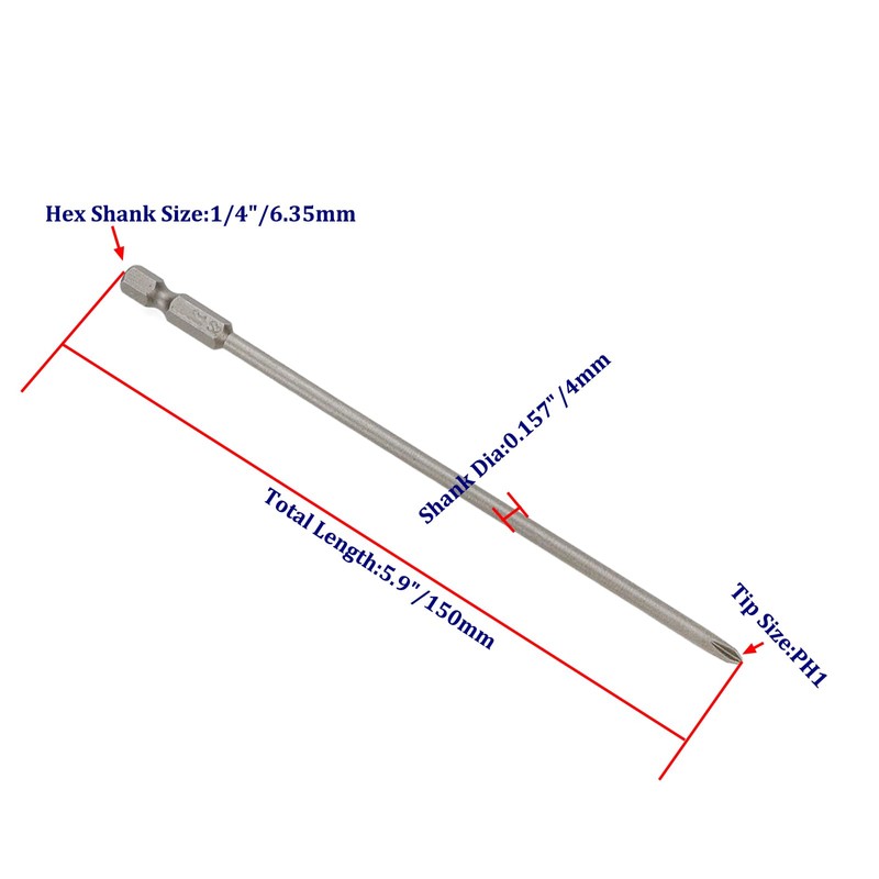 - Dimension-Tip Size:PH1; Total Length:5.9"/150mm; Hex Shank Size:1/4"/6.35mm;Shank Dia:0.157"/4mm