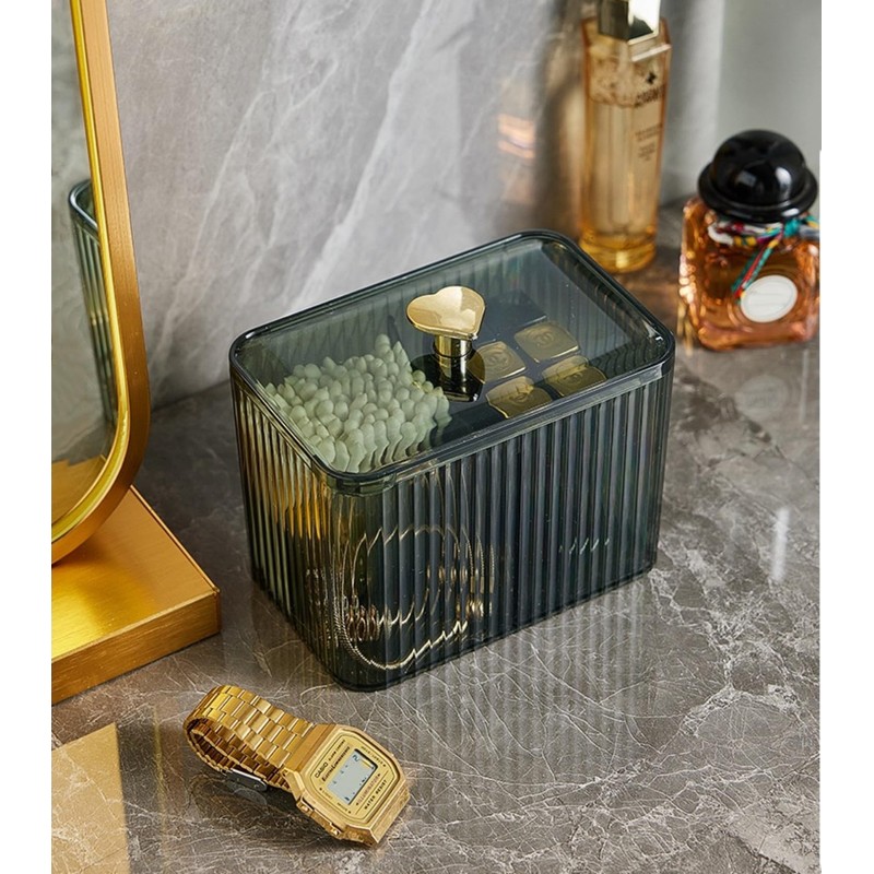 - 【Modern and Stylish Appearance】Features an elegant gold heart handle and a ribbed non-slip body. The acrylic cotton swab holder with chic design enhances your bathroom, bedroom, or vanity with a touch of sophistication, blending style with functionality.