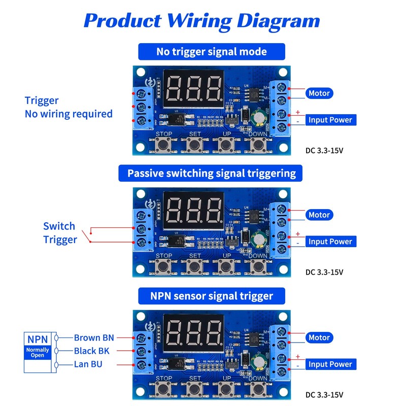 Ransanx 2pcs 3.3V-15V DC Motor Controller 50W Forward and Reverse Controller Automatic Cycle Timing delay Module Signal Trigger Brushed Motor Time delay Relay Limit Switch 18 Functions