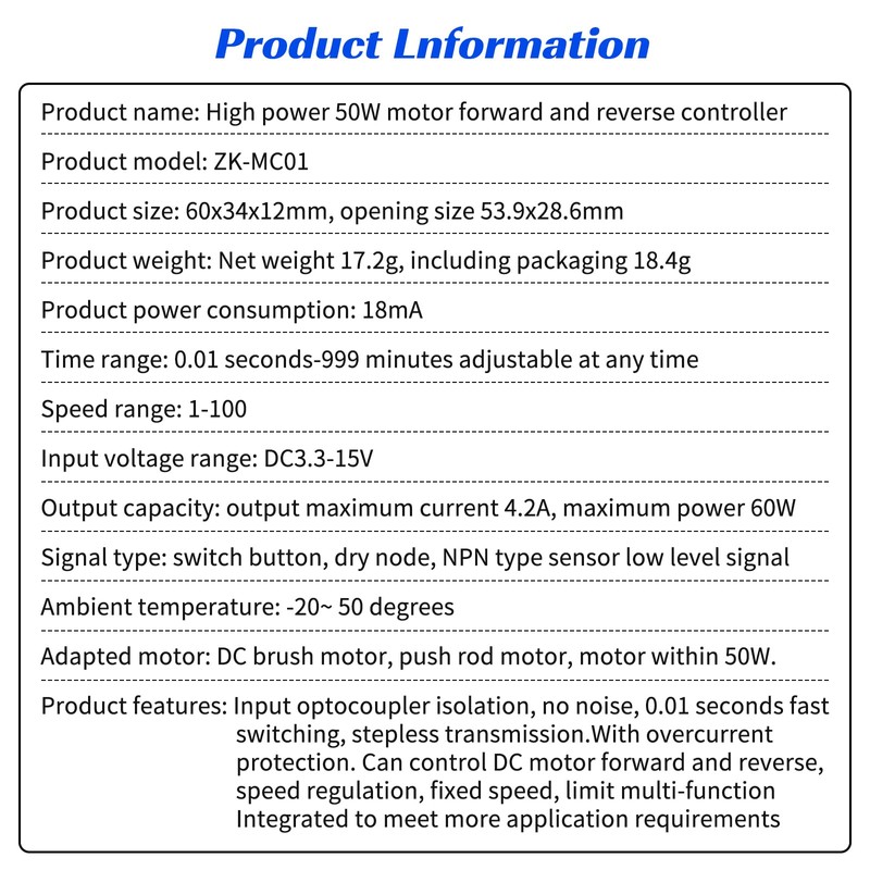 • Product features: Input optocoupler isolation, no noise, 0.01 second fast switching, infinitely variable speed,With overcurrent protection. Can control DC motor forward and reverse, speed regulation, fixed speed, limit multi-function Integrated to meet more application needs.