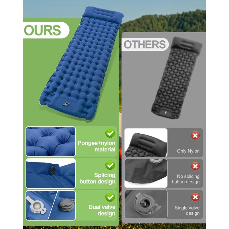 - Thick & Wide Upgraded Camping Mat - Introducing our premium sleeping mats camping, the inflatable camping mattress that stands out with its enhanced thickness and width. Meticulously designed using ergonomic principles, this camping sleeping mat ensures a night of comfort by keeping you well-elevated from cold ground and uneven surfaces. The increased width provides ample space for a truly restful camping experience.