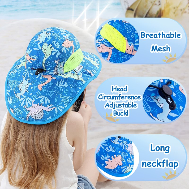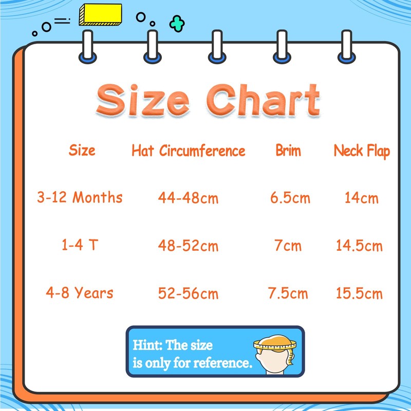 - Protect Baby's Skin and Neck: Our kids sun hat features UPF 50+ which can block 98% of UV rays.2.55 inch brim is wide enough and 5.11 inch flap is long enough to protect baby's neck and eyes.Wide brim of our kids beach hat protects children's head, eyes, face, neck from strong sunlight. And the brim of baby boy hats is sturdy enough, will not fall down/collapse or hung down in front of baby's face.