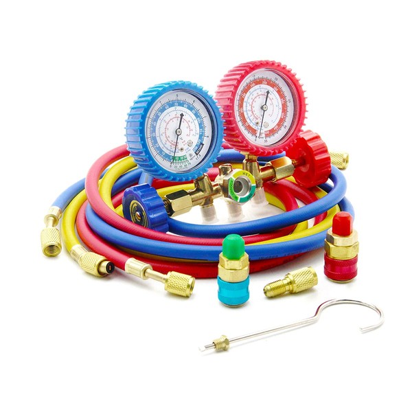 **\--Specifications--** Temperature Scale: Celsius Max Working Pressure: 500PSI Burst pressure: 2500PSI Hose Length: 60" / 152 cm Couplers: High & Low Pressure Side Quick Connector/Adapters (1/4" SAE Male Flare Straight) Condition: 100% Brand New **\--Package Includes--** 1x Dual Gauge Manifold with Built-in Sight Glass 3x 60" Charging Hoses (Red, Yellow & Blue) 2x A/C Quick Couplers (Red = High Pressure, Blue = Low Pressure) 1x R-410A Straight Adapter for Mini Split System Air Conditioners (1/4" to 5/16") Instructions not included **\--Special Statements--** There may be some deviations of the physical due to personal measurement technique is different. Small color difference, is subject to material object. If there is anything unexpected, please contact us. We can help you in 24 hours.