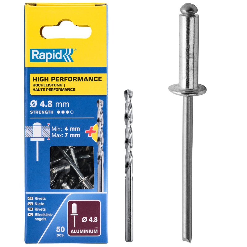 - Box contents: Rapid blind rivets, universal aluminium, 4.8 x 10 mm, 50 pieces, drill, box, 5000387
