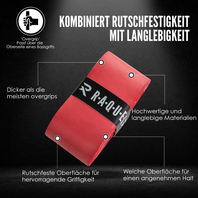 - Highly absorbent - Thanks to our own material blend, these overgrip bands absorb moisture and sweat to keep your hands dry even in the toughest competition conditions. The Raquex Endure Overgrip Tape offers the perfect balance of comfort, durability and adhesion for an optimal, non-slip grip. Choose from eight eye-catching colours: black, white, yellow, red, royal blue, navy, light purple and dark purple.