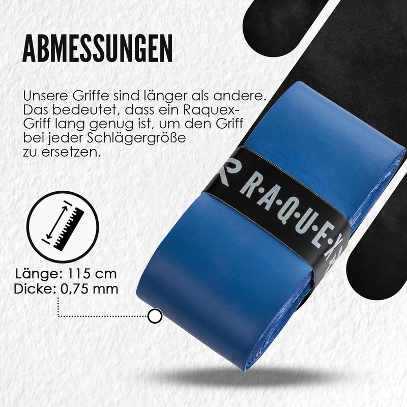 - ONE SIZE FOR ALL - Our non-slip overgrip tape for tennis, badminton and squash has an extra long, universal length of 115 cm and is easy to cut. Full instructions are included with every order by email. Each overgrip tape has a self-adhesive initial strip and comes with Raquex finishing tape to fix the end.