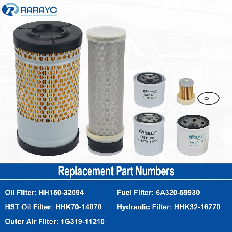 - Replacement Part:Includes Oil Filter: HH150-32094 Fuel Filter: 6A320-59930 HST Oil Filter: HHK70-14070 Hydraulic Filter: HHK32-16770 Outer Air Filter: 1G319-11210.