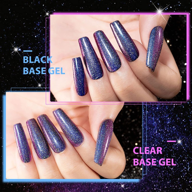 - 【HOW TO GET A GREAT COLOR CHANGING EFFECT】We recommend applying on long nails will make the effect more obvious. In order to make a great effect we suggest use a black base,black shade tend to create a more fabulous effect.Due to various coating thickness and viewing angle of gel polish,the effect will be different.