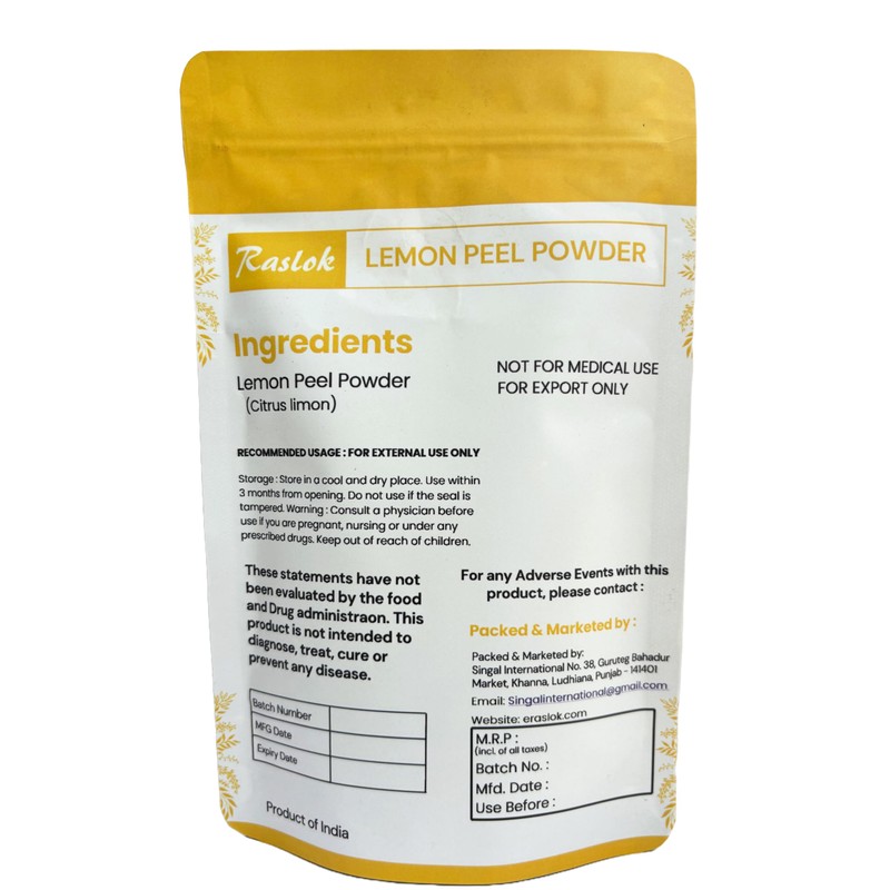 • 100% Lemon Juice: Raslok Lemon Peel Powder is a pure and unadulterated source of lemony goodness. It's made from 100% lemon juice, freeze-dried to preserve its natural flavor and vitamin C content.