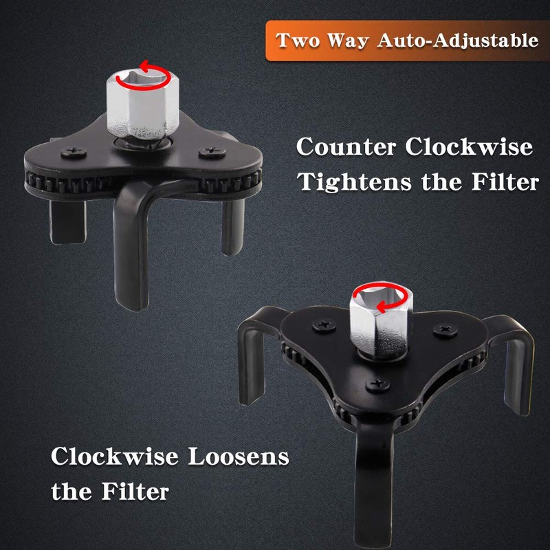 - 【TIGHT GRIP】3 Jaw grip ensures oil filter wrench with firm hold on filter,cooperating with Two Way Auto-Adjustable, helping users remove filters quickly, with less slip and without hassle. Claws fit tighter as more torque is applied. This oil filter wrench is designed to help you remover the toughest filters on your vehicle.