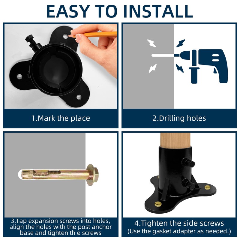 - EASY TO INSTALL: Pre-drill ahole for easy installation, just apply the attached kit to fix the post base on concrete floor. Comes with the necessary screws.