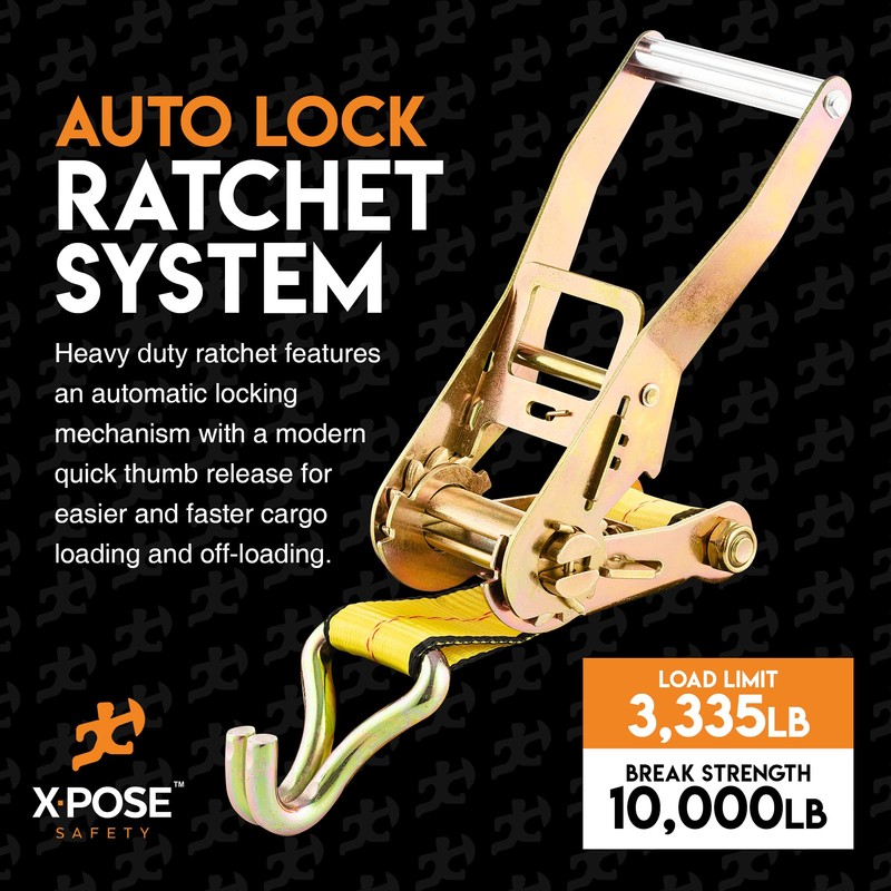 - EASY TO USE AUTO LOCK - These heavy duty ratchet strap tie downs feature an automatic locking mechanism with a modern quick thumb release lever coated in soft rubber for comfortable operation in any weather.