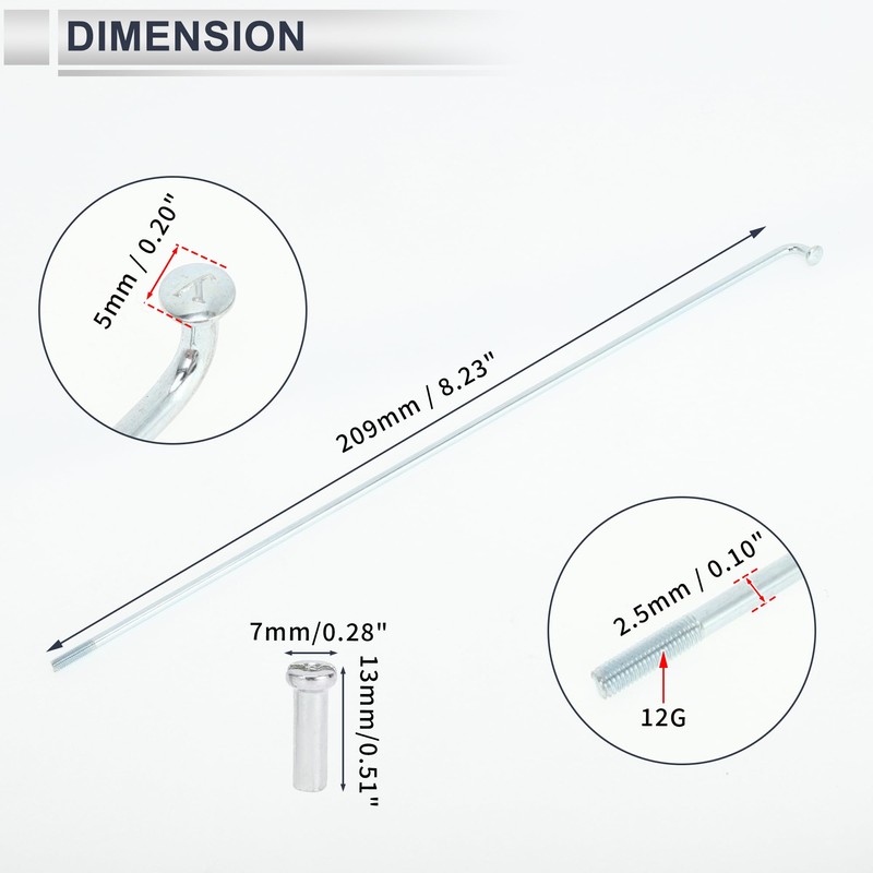 - Functionality:Thread Size: 12G; Spoke Length(without Elbow): 209mm / 8.23"; Spoke Elbow Head Diameter: 5mm / 0.20"; Spoke Shaft Diameter: 2.5mm / 0.10"; Nipple Size: 13x7mm / 0.51"x0.28"(L*D)