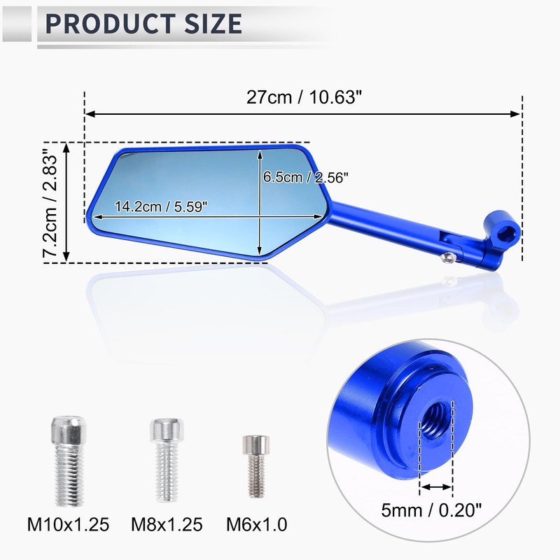 - Functionality:Type: Motorcycle Mirror, Position: Handle Bar, Material: Aluminum Alloy, Shell Color: Blue, Glass Color: Blue, Mirror Size: 14.2x6.5cm / 5.59"x2.56"(L*W), Total Size: 27x7.2cm / 10.63"x2.83"(L*W), Install Hole Diameter: 5mm / 0.20", Thread Size: M8x1.25, M10x1.25, M6x1.0.