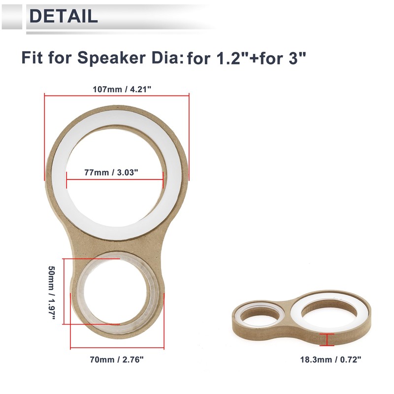 - Functionality:Fit for Speaker Dia:for 1.5"+for 3" Depth: 18.3mm / 0.72" Inner Diameter 1: 77mm / 3.03" External Diameter 1: 107mm / 4.21" Inner Diameter 2: 50mm / 1.97" External Diameter 2: 70mm / 2.76"