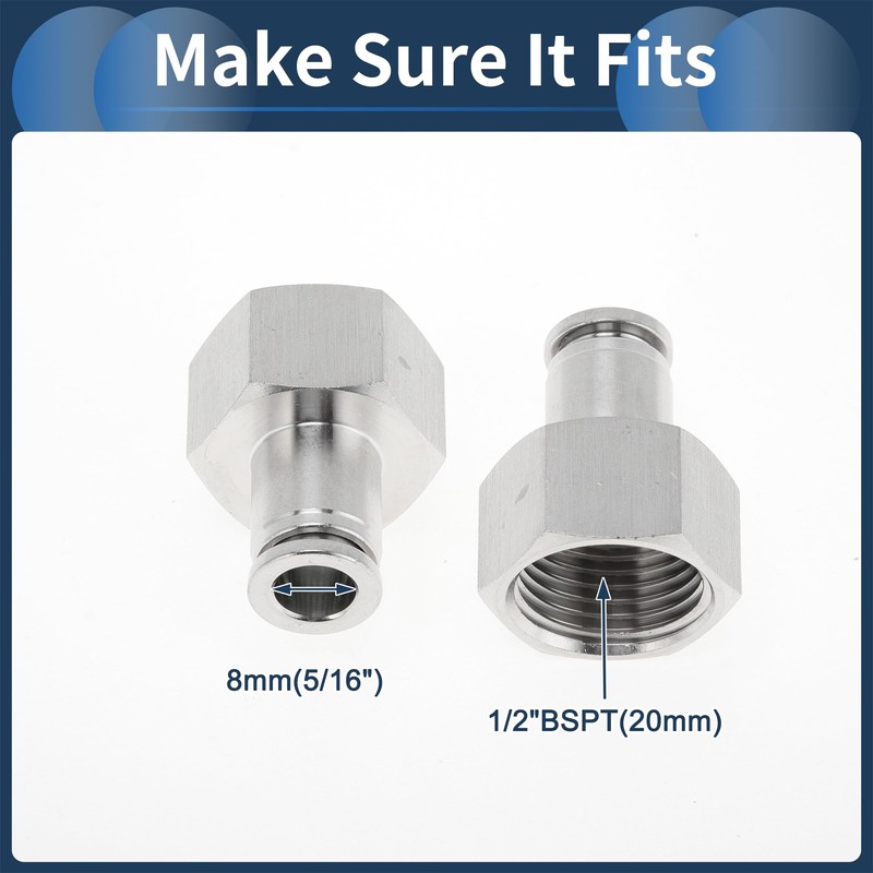 RATCHROLL Push to Connect Air Fittings 5/16" Female Thread Air Line Quick Connector 304 Stainless Steel 1/2"BSPT 2 Pcs Silver Tone