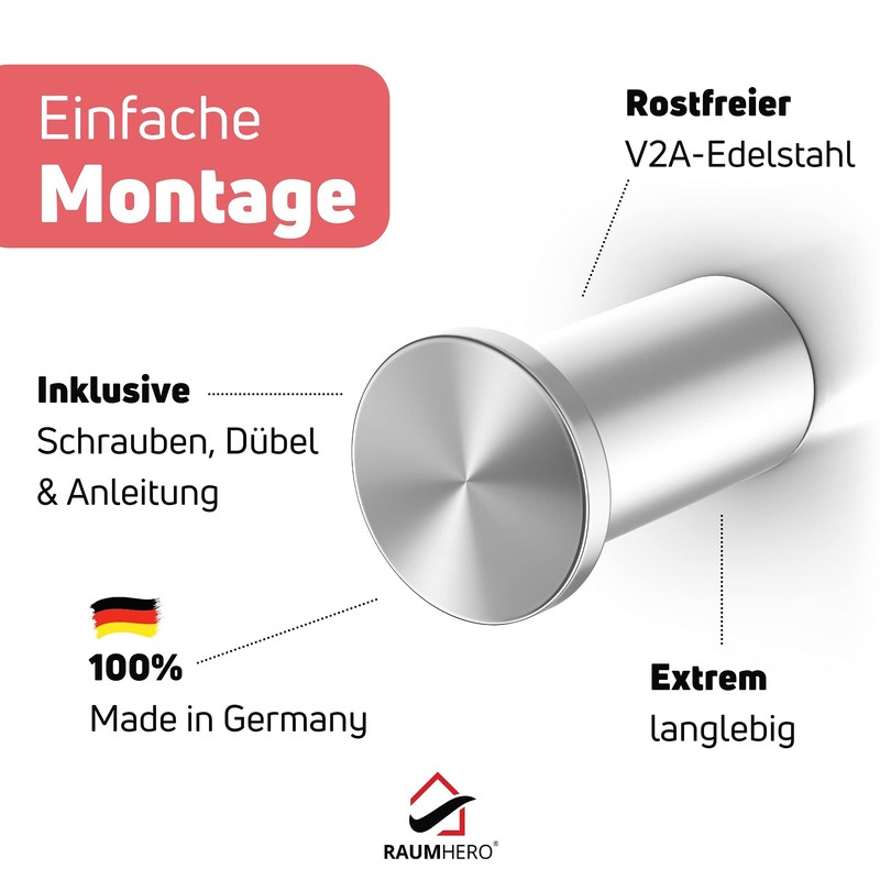 Raumhero® Coat Hooks (4 Pieces) – Coat Hooks Stainless Steel Towel Hooks for Drilling – 100% Made in Germany (Load Capacity up to 30 kg) – Extremely Versatile (Including Screws, Dowels & Instructions)