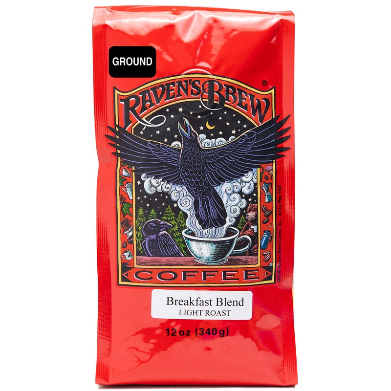 - RAVEN’S BREW BREAKFAST BLEND LIGHT ROAST COFFEE – THE LAST LEGAL HIGH—Coffee, the precondition for consciousness. Long ago, far away, in a seascape of countless islands shrouded in mist and robed in dense forests, Raven’s Brew Coffee came into being. Amazing no matter how it’s brewed: drip, press, cold brew and more! Light body of toffee and citrus. This blend is particularly brisk and wakeful with a slight, refreshing acidity.