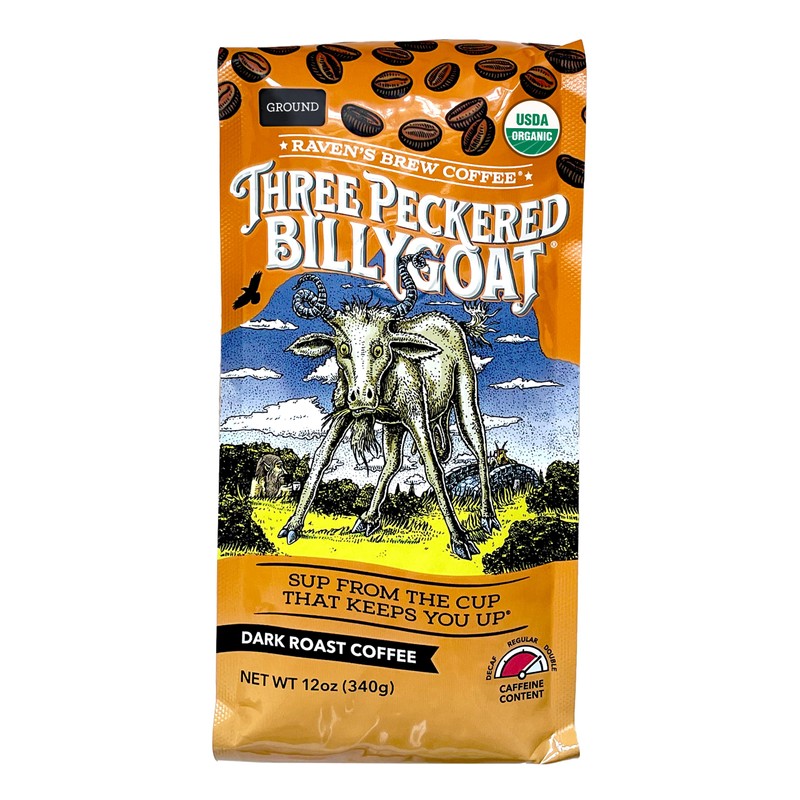 Raven's Brew Coffee Three Peckered Billy Goat, 12 Ounce - Dark Roast - Full Body with a Long Sweet Finish (Organic Ground, 12 oz)