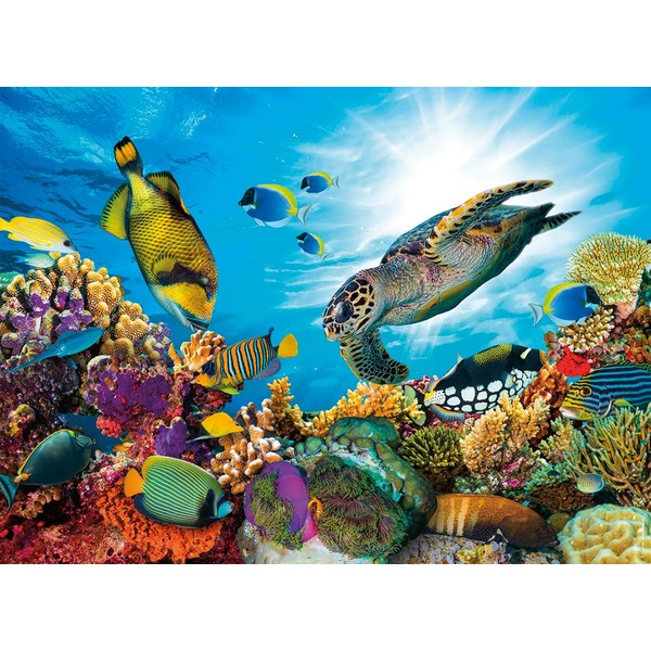 - Undermarine world: reefs are underwater structures built by corals. In this picture many species such as a turtle or many fish such as angelfish, surgical fish or Naso elegans can be observed.