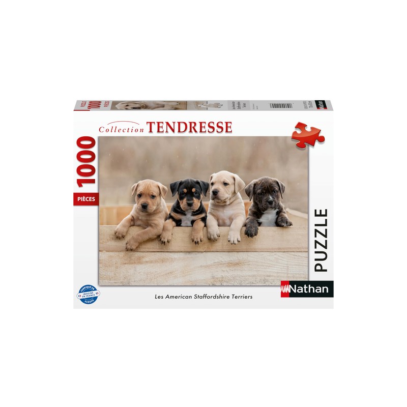 • AMERICAN STAFF: The American Staffordshire Terrier is an ideal dog for the family despite its thoughtful character and strong personality. You can recognise it especially by his short fur, his rather square head and his muscular chest. The small ball as a baby will melt any dog lover.