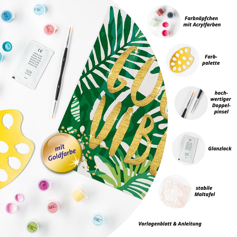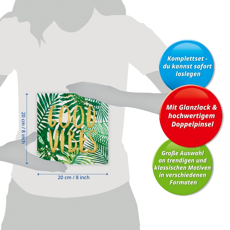 - The painting set contains ready-mixed acrylic paints in resealable and numbered bowls, a sturdy painting board in the format 20.00 cm x 20.00 cm, gloss varnish for finishing, a brush and instructions (English language not guaranteed)