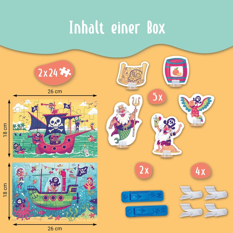 - Box contents: 2 puzzles, each with 24 pieces, 5 cardboard toy figures with stand, 4 transparent clips for connecting the boxes, 2 stands for the boxes, 1 story booklet, 1 instructions (English language not guaranteed)
