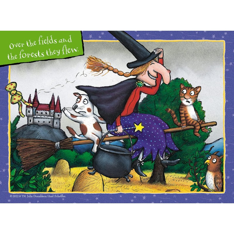 - A kind witch and her cat who invite three other animals (a dog, a bird and a frog) to join them travelling on her broomstick in this wonderful set of puzzles.