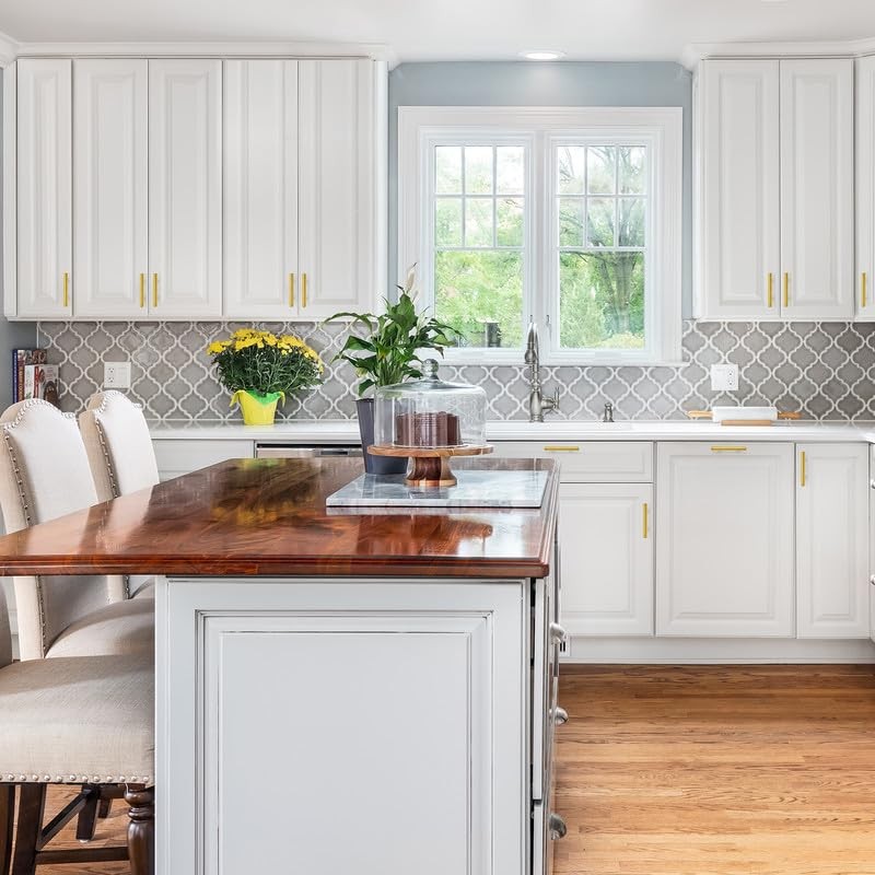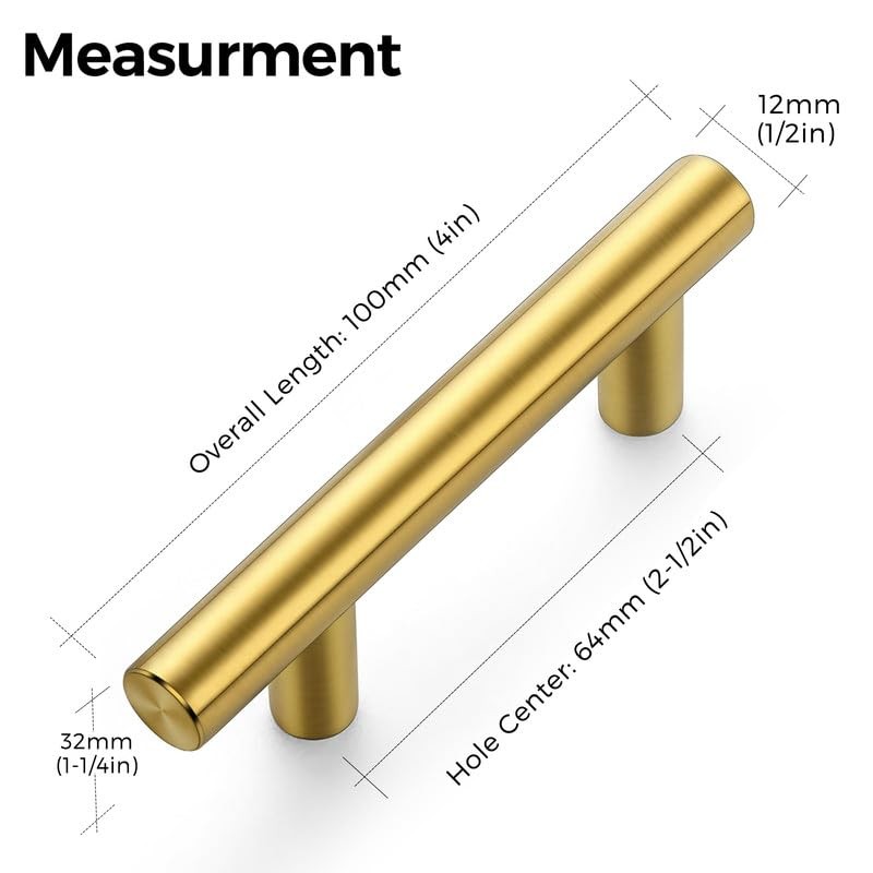 - Timeless aesthetics - Versatile gold T bar cabinet handles complement different cabinet doors and drawers. The gold finish gives a clean and timeless look that is suitable for farmhouse, vintage, traditional and transitional styles.