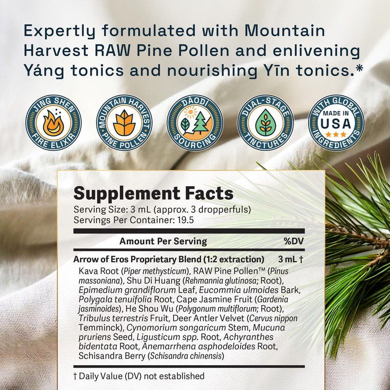 - Expertly Crafted Jīng-Shén Elixir – Designed to support desire, ease tension, and cultivate deep connection, Arrow of Eros is purposefully crafted around Pine Pollen with enlivening Yáng tonics and nourishing Yīn tonics.*