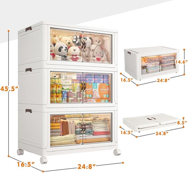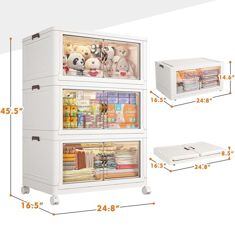 Two Ways to Open & Magnetic Door: Collapsible storage bins with wheels has double ways to open the door and transparent visible windows. You can open it from the top door and front door,can quickly find your target item. Stackable storage bins open front have magnetic lock buckles can prevent dust from entering the cabinet.