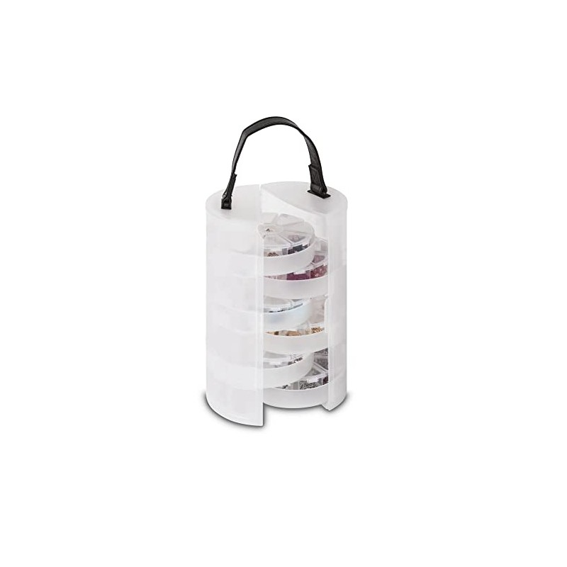 Rayher 39499000 Sorting box, for small parts, round, diameter 13 cm, with carrying handle, transparent, for ironing beads, sequins, beads, gemstones, rhinestones and glitter, round box, jewellery box.