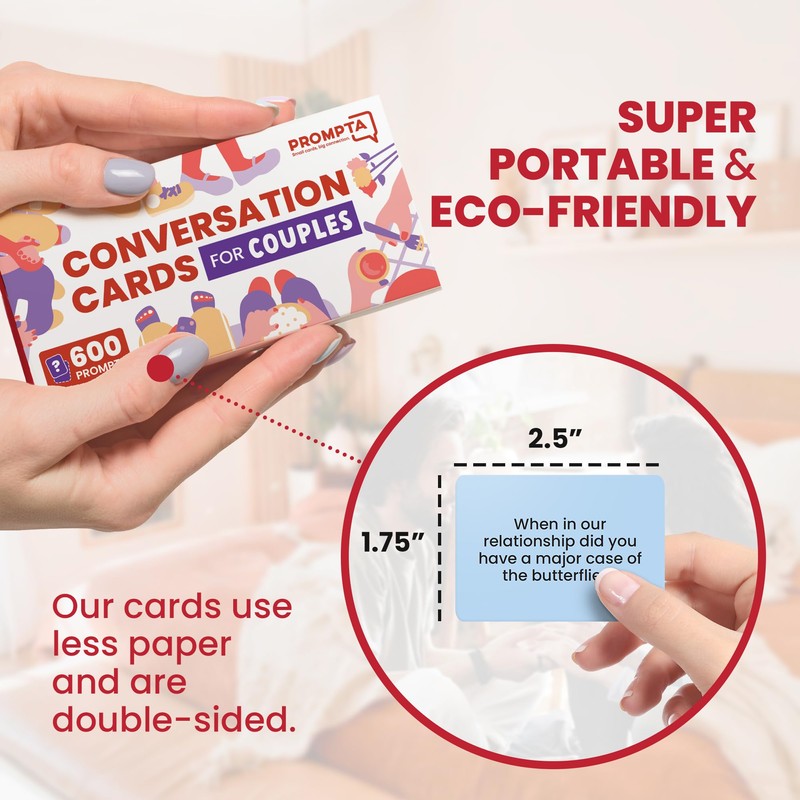 - Includes 600 questions! 2-6x the number of cards offered by other conversation card sets. The cards are small (2.5” x 1.75”) and double-sided with no branding, because all that matters is the questions printed on them and the experience you and your partner have using them.