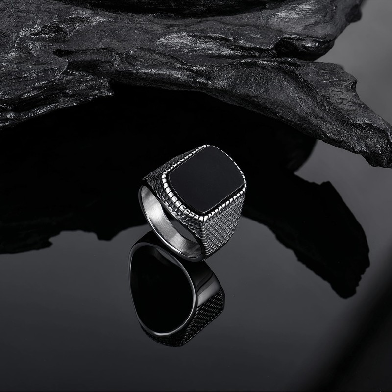 Raymard Onyx Stainless Steel Textured Signet Rings for Men, Size 7-12, Stainless Steel, Onyx