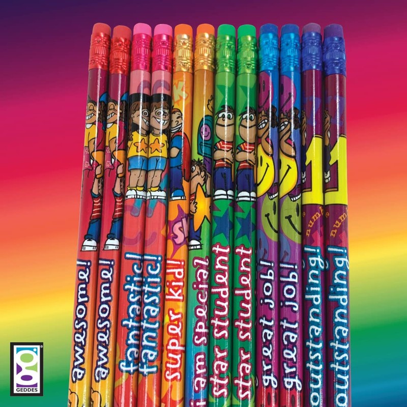 Raymond Geddes Incentive Pencils are great rewards and incentives for the kids or students. These Cartoon characters wrapped wood pencils can congratulate your kids for their special achievements. The Geddes Incentive pencils say Awesome!, You Did It!, Excellent!, Honor Student, I Am Special, Fantastic!, and more with their colorful cartoon characters and sayings.
