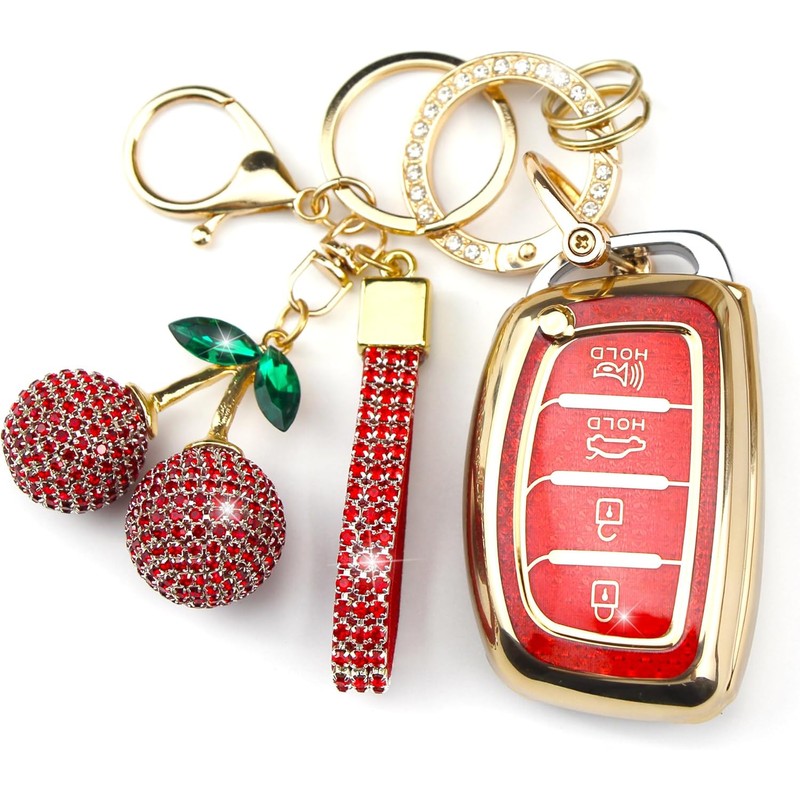 Rayslesan Sparkly Key Fob Cover with Cherry Keychain, Bling TPU Smart Key Case for Women, Compatible with Hyundai Santa Fe Santa Fe Sport Sonata Sonata Sport (4-Button, Gold Red)