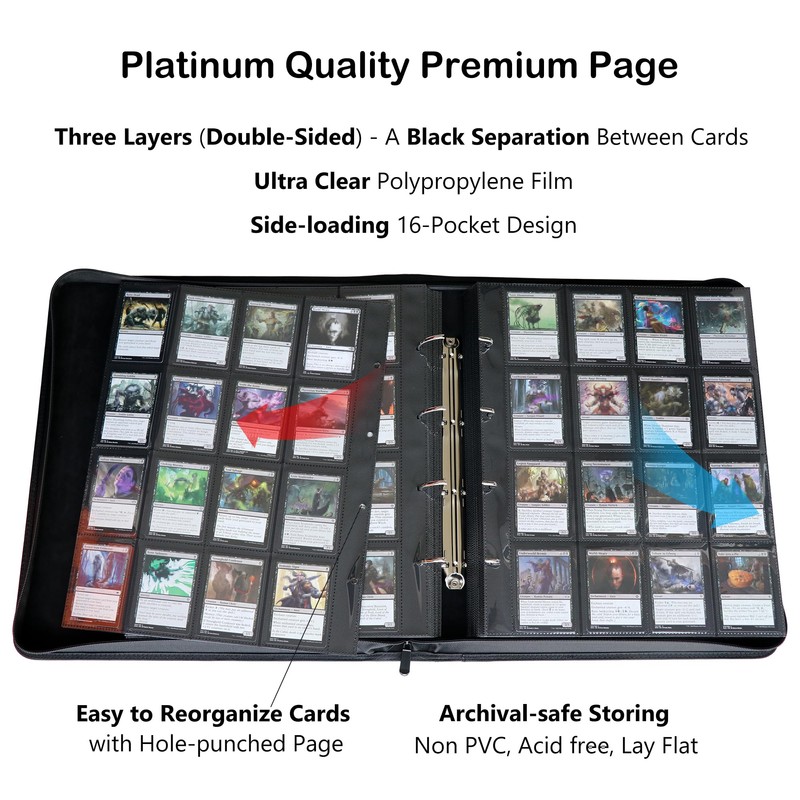 - Premium Pages:Double sided low-friction black backing, creating a separation between the front and back pockets, as well as providing cards a classic framed look.